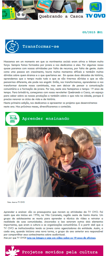 De um projeto de oficinas de vídeo na zona oeste de Santa Maria ao reconhecimento como um dos primeiros Pontos de Cultura da cidade. Em seus 29 anos de história, a TV OVO saiu da casca e tornou-se referência de coletivo e de produção audiovisual.